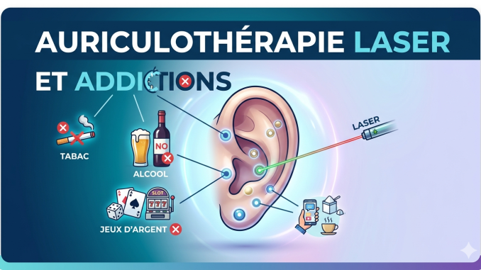 Le pavillon de l’oreille concentre environ 200 points réflexes connectés au système nerveux central. La stimulation par laser froid de points auriculaires spécifiques envoie des signaux à l’hypothalamus, induisant une réponse parasympathique : baisse du cortisol, libération d’endorphines et de sérotonine. Le circuit de récompense, hyperactivé par la dépendance, retrouve progressivement un équilibre naturel. La méthode est reconnue par l’OMS depuis 1987.